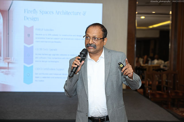Sunil Pinto introduced government incentives for existing businesses, startups and aspiring entrepreneurs, covering MSME registration, market development assistance, sector-specific schemes, StartUp India, GeM registration, and more. He highlighted their benefits, ranging from priority in government tenders to employability, and showcased live demos of government portals.