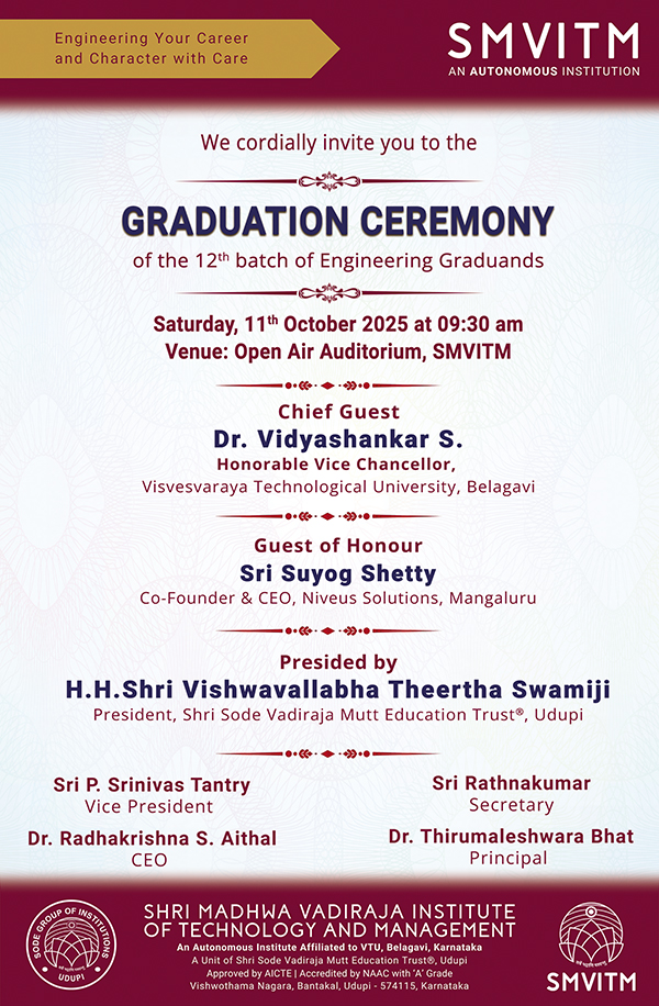 Dr Vidyashankar S, vice chancellor, Visvesvaraya Technological University, Belagavi, will be the chief guest and he will deliver the ‘Graduation Day Address’. Sri Suyog Shetty, co-Founder & CEO, Niveus Solutions, Mangaluru will be the guest of honour for the event. H H Shri VishwavallabhaTheertha Swamiji of Shri Sode Vadiraja Math will preside over the function.