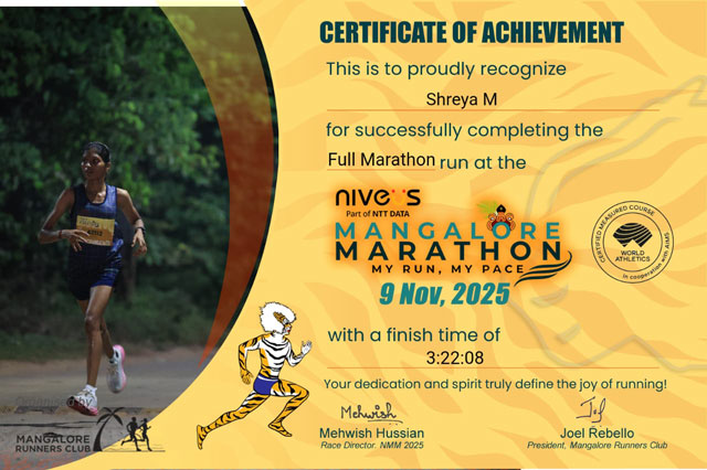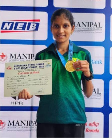 She also clinched the gold medal at the Niveus Mangalore Marathon (42 km) with an impressive timing of 3 hours and 22 minutes. Additionally, she secured medals at the Revel’s Cup, MIT Manipal, and the Karnataka State U23 Athletic Meet in Udupi, where she qualified for the National U23 Championship.