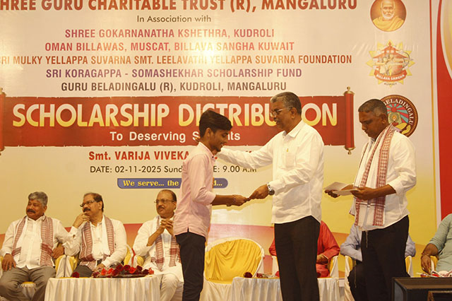 The 2025 Scholarship Distribution and Motivation Programme was held on Sunday, November 23, at the Adhyaksha Koragappa Memorial Hall, Shree Gokarnanatha Kshetra, Kudroli, Mangaluru.