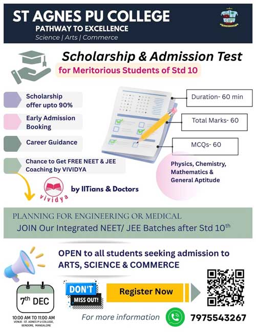 To give deserving Class 10 students an opportunity to join its legacy of academic and value-based learning, St Agnes PU College is organising a scholarship and admission test on December 7 from 10 am to 11 am at the college campus in Bendore. The test aims to identify and support meritorious students by offering scholarships of up to 90 percent, early admission opportunities, and career guidance.