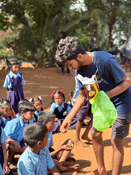 The We Care volunteers from St Aloysius University started Day 3 of the rural camp in Inaamniralgi Village, Hangal. The 34 students, led by Clarence Serrao and Gopika, woke up in their host homes. They played Lagori, a fun game, with the village kids to start the day with laughter and energy.