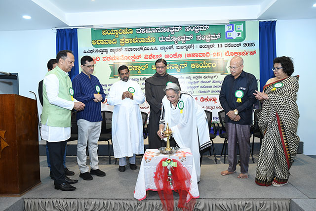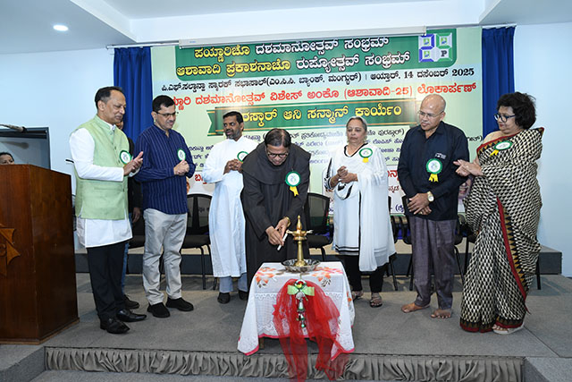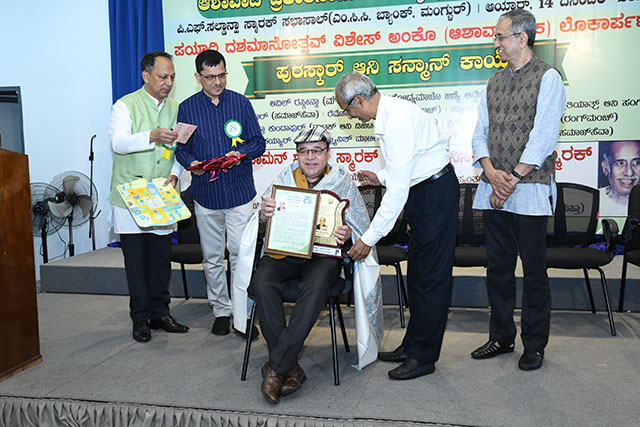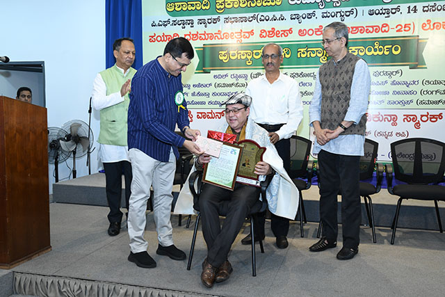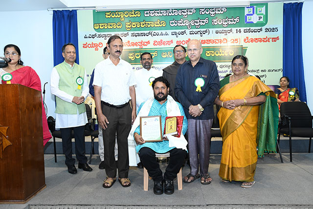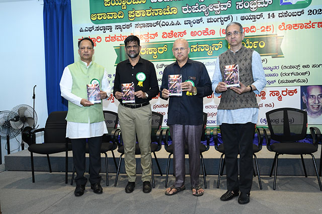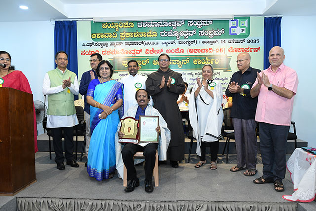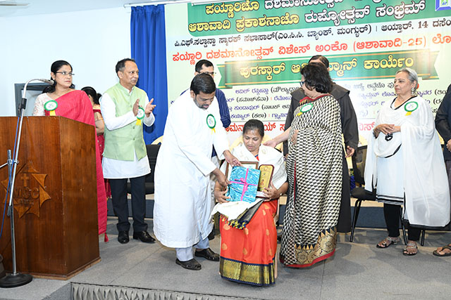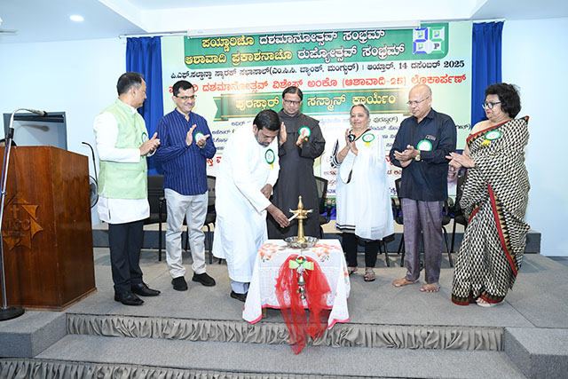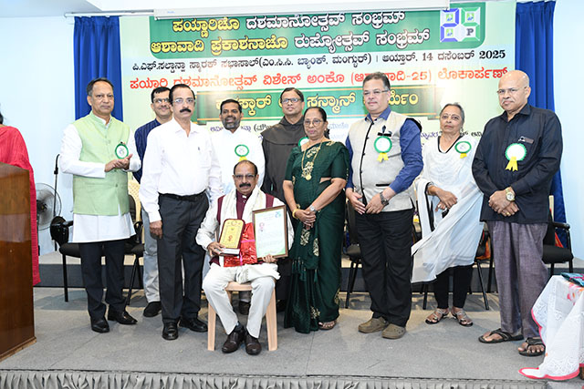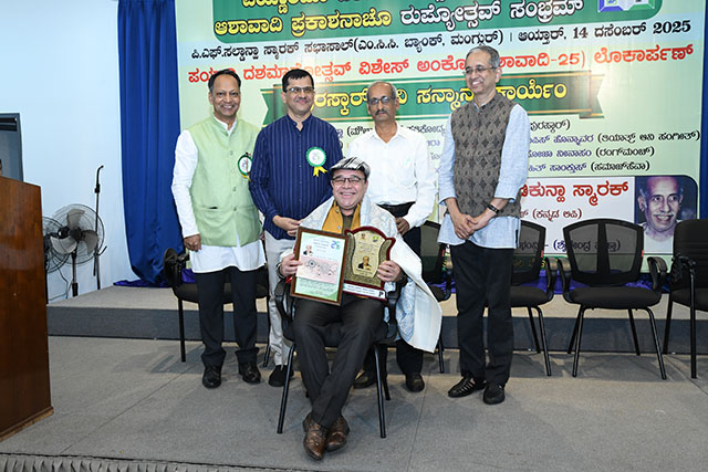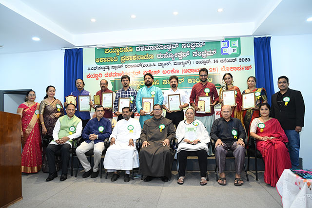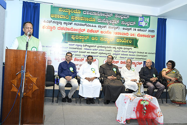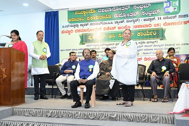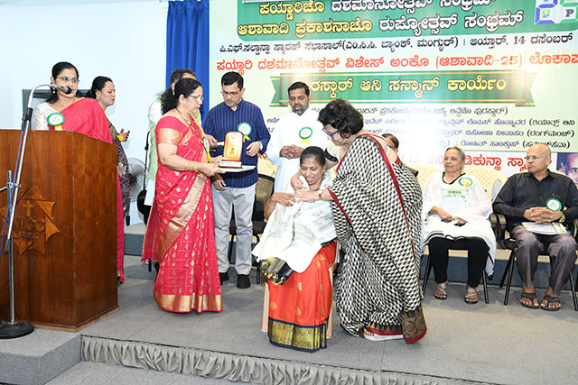 Mangaluru, Dec 23: The silver jubilee of ‘Ashawadi Prakashan’, which was started in Kuwait in 2000, and the 10th anniversary of Poinnari.com, a three-script Konkani literary website launched in Mumbai in 2015, were jointly celebrated with great enthusiasm on Sunday (December 14) at the MCC Bank PFX Auditorium in Mangalore. Basti Vaman Shennoy Memorial 25 Konkani books, Lifetime achievement award for value-based Konkani journalism and felicitation of those who contributed to the fields of literature, art, theatre, dance, social service, etc. and the first ever ‘Late Dennis D’Cunha Memorial Ashaawadi Transliteration Book Award Ceremony’ for a Konkani book transliterated into Kannada script were all part of this celebration.