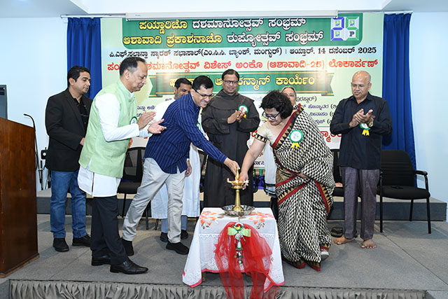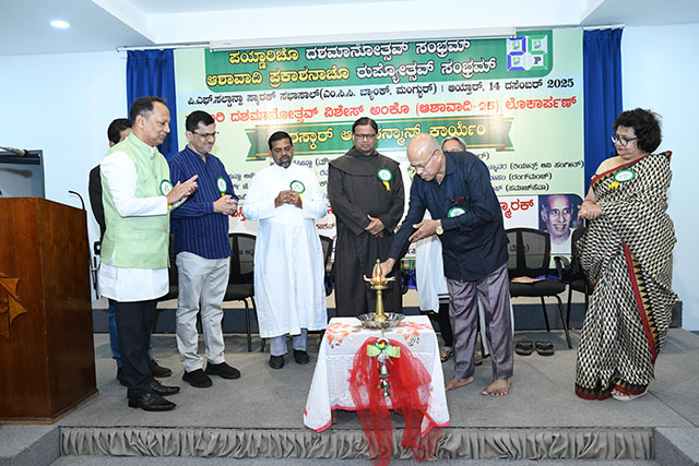 The programme was inaugurated by Fr Ronald Prakash D'Souza Ajekar. Founder of Ashawadi Prakashanada and editor of Poinnari.com Valley Quadras Ajekar delivered the welcome address, renowned Konkani poet Andrew L D'Cunha gave a detailed talk '25 years journey of Ashawadi Prakashan' and Fr Melvin D'Cunha released the 'Poinnari Decennial Special Issue (Ashawadi-25)'. The chief guests were Nandagopal Shenoy (Vishwa Konkani Kendra, Mangalore), Dr Chandralekha D'Souza (Retd HOD, Konkani department, Goa University), and Corinne Rasquinha (White-Doves).