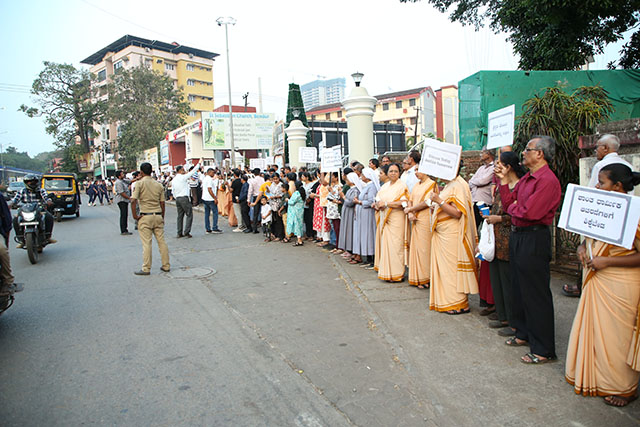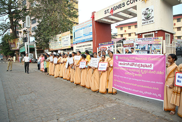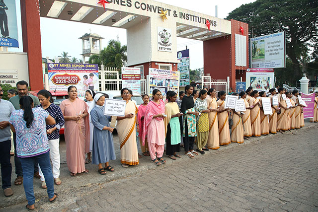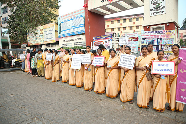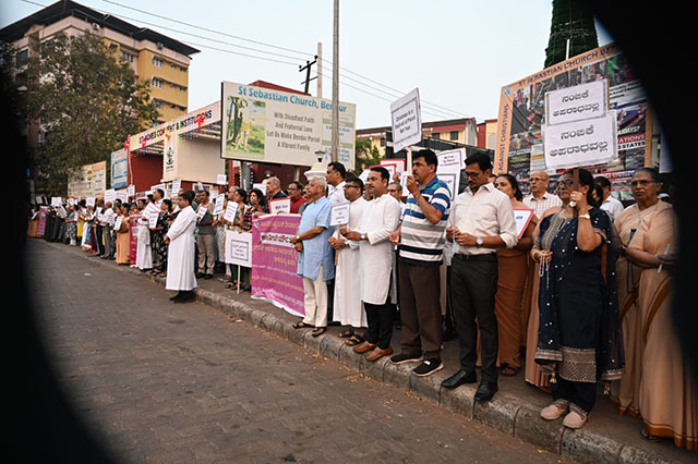 The protest was led by the parish priest Fr Walter D’Souza, along with assistant priests Fr Vivek Pinto and Fr Ozmond D’Souza, and Fr Arun Lobo, principal of Padua College. Parish vice president Deepak D’Souza, secretary Royston Farias, office bearers and members of parish associations, convent superiors and sisters, and a large number of parishioners were present, standing together in solidarity.