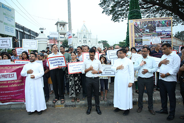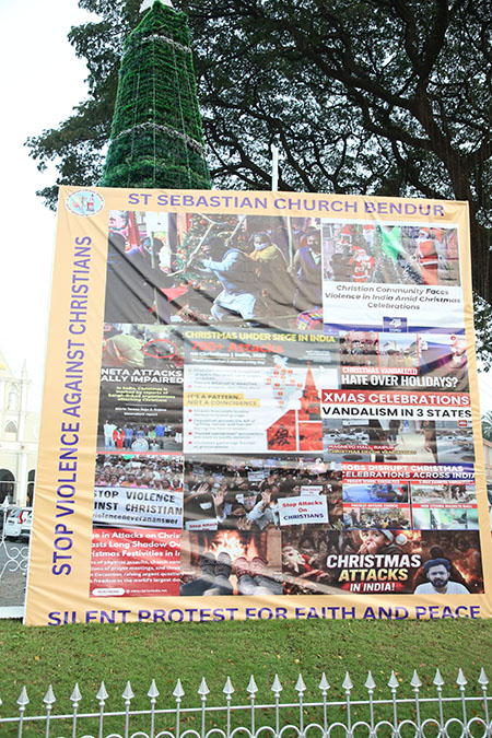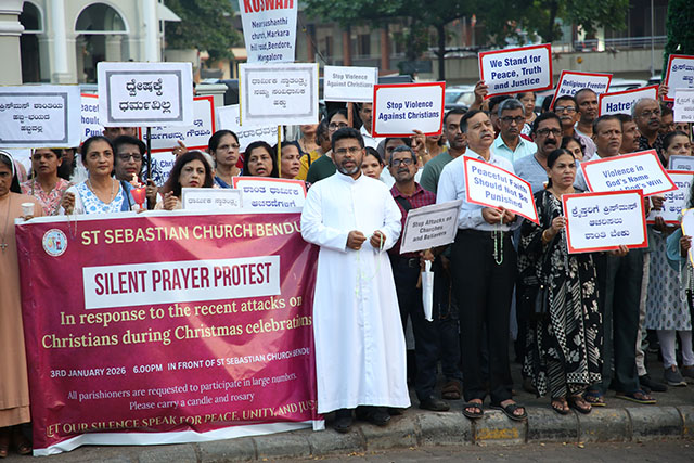 Mangaluru, Jan 3: St Sebastian Church, Bendur, organized a silent prayer protest against the recent attacks on Christians during the Christmas celebrations to express their gradiences. The protest was held on Saturday January 3 in front of the church premises, witnessing a strong expression of faith, unity, and peaceful resistance.
