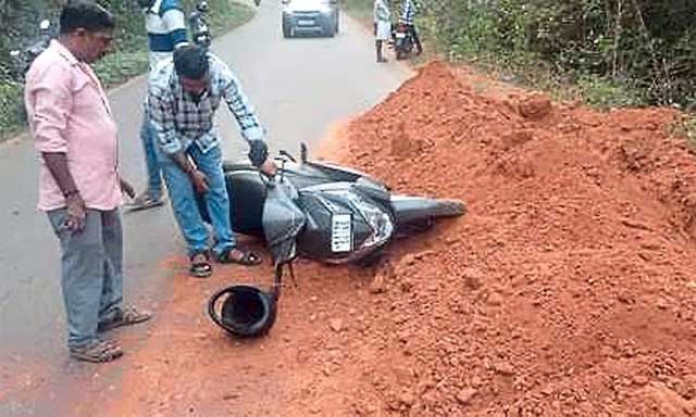 The accident occurred after the two-wheeler rode over mud that had spread across half the road. The mud was dumped following excavation work carried out about a week ago for laying pipelines under a multi-village drinking water project. Loss of control on the muddy stretch led to the mishap.