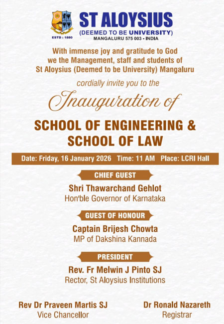 The programme will also be graced by the guest of honour, Captain Brijesh Chowta, member of Parliament, Dakshina Kannada. Fr Melwin J Pinto, SJ, rector of St Aloysius Institutions and Dr Praveenn Martis, SJ, vice chancellor of the University and Dr Ronald Nazareth, registrar of the University will present for the programme.