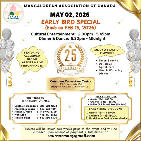 During Vijay Dante’s tenure, the MAC had very fruitful years during 2024-2025, a real drive towards unity among Mangalureans in the GTA and within Canada, and a keen passion for keeping the flame of Konkani culture and traditions burning brightly, especially through the most cherished Monthi Fest and the thrilling success of Christmas Bazaar. The members expressed gratitude to the outgoing president, Vijay Dante, vice-president Janet D’Souza, and the executive committee, who have served the Mangalurean community tirelessly by promoting MAC in the GTA and within Canada.