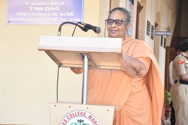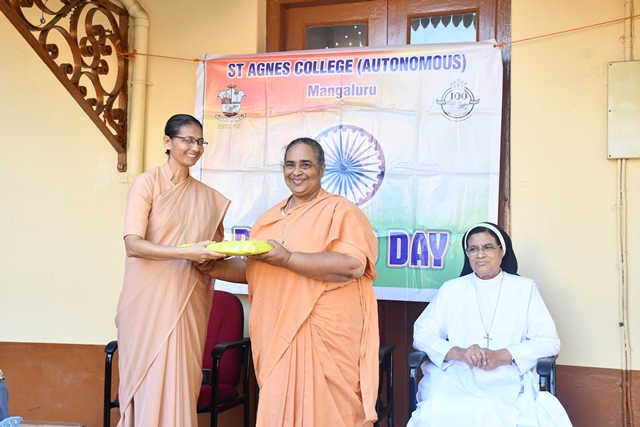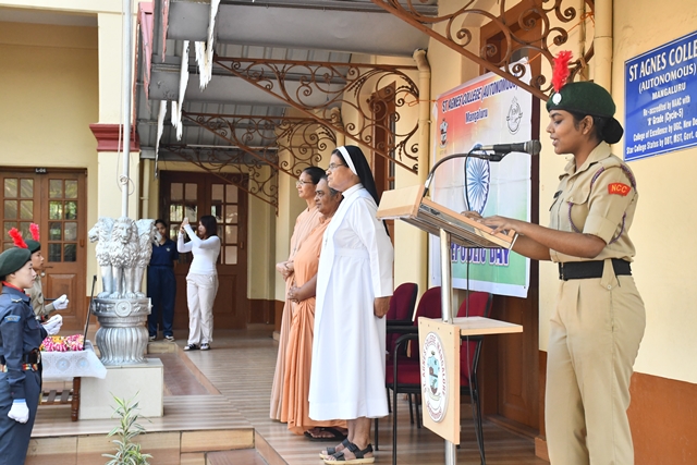 Mangaluru, Jan 27: 77th Republic Day celebration 2026, was commemorated by St Agnes College (Autonomous), Mangaluru. This celebration was graced by the chief guest, Sr Maria Jyotsna AC, the head mistress of St Agnes Kannada Higher Primary School. The event started with the chief guest, the superior, principal, and administrator of the college being escorted by NCC cadets along with the ANOs of NCC Army and Air Wing, Lt Gayathri BK and Flg Offr Dr Hithakshi B.