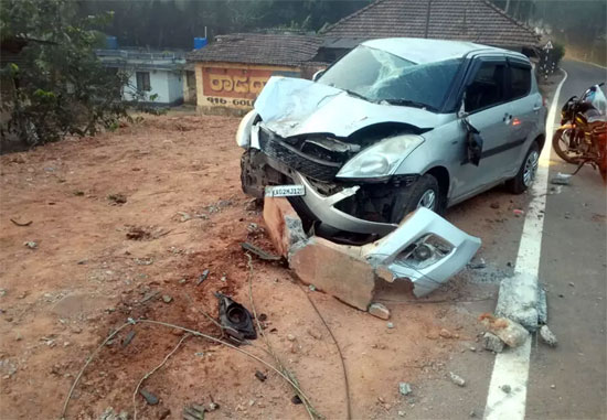 The front portion of the car was completely damaged due to the impact of the collision, while the electric pole broke and collapsed. It is learnt that the occupants of the car escaped with minor injuries.
