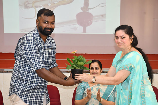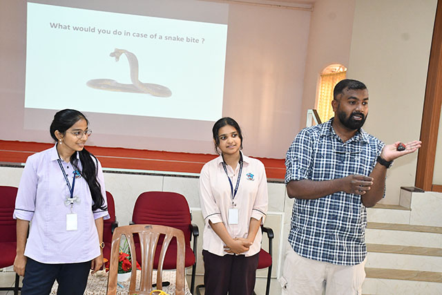 The programme commenced with a formal welcome and introduction of the resource person by Dr Rachana L Alva, HoD, Department of Zoology. During the session, the resource person provided detailed insights into diversity of snakes found in Karnataka, identification of venomous and non-venomous species, common myths and misconceptions about snakes, first aid measures during snakebite incidents, the ecological importance of snakes in maintaining balance in ecosystems through engaging visuals, real-life case studies and interactive discussions. He emphasised the importance of awareness rather than fear. He highlighted how habitat destruction and urban expansion increase snake encounters and stressed the need for responsible environmental practices.