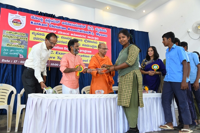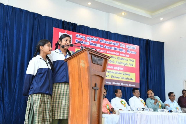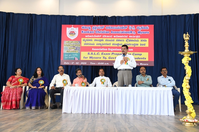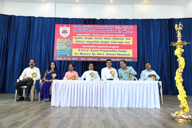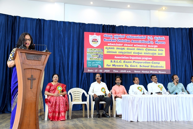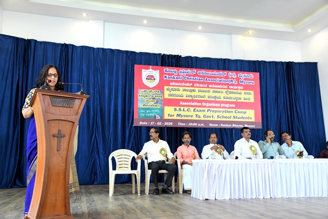 Mysuru, Feb 20: The Konkani Christian Association (R) Mysuru had organized a motivational talk for Rural Government School SSLC students of Mysuru Taluk on 17th February 2026 at their prominent Konkan Bhavan, Vijayanagar 2nd stage, Mysuru. The programme began at 10.30am with the prayer song sung by the students of Karnataka Public School, M.G. Koppal. Joyce Sequeira, the secretary of the Association welcomed the dignitaries on the dais. The event was inaugurated with the lighting of the lamp by the dignitaries, Uday Kumar D, DDPI, Department of School Education, Mysuru District, Prakash M, block education officer, Mysuru Rural, Fr Santhosh John, parish priest, Holy Family Church, Hinkal and Dr Shambhulinga B Pavate, Yoga trainer and counsellor, Mysuru.