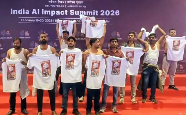 On Friday, a group of IYC workers staged a protest inside an exhibition hall at the Bharat Mandapam during the AI Impact Summit. The protesters removed their shirts to reveal T-shirts printed with slogans against the government and the India-US trade deal, before being escorted out by security personnel.