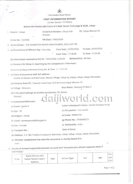 The complaint was lodged at the Udupi Women police station by a woman identified as Jyothi. Based on her complaint, police registered a case under Crime No. 12/2026 dated February 19, 2026, under Section 74 of the Bharatiya Nyaya Sanhita (BNS), 2023.