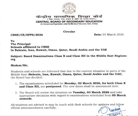 New Delhi, Mar 1: The Central Board of Secondary Education (CBSE) has postponed the Class 10 and Class 12 board examinations scheduled for March 2, 2026, in several Middle Eastern countries in view of the prevailing situation in the region.