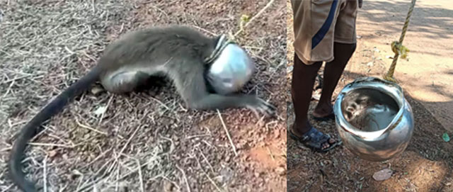 Local social worker and environmental enthusiast Naveen Kumar Chitrabailu, along with Sukesh, Harish Ram and Vishwanath, noticed the monkey moving around the area in distress with the pot stuck on its head.