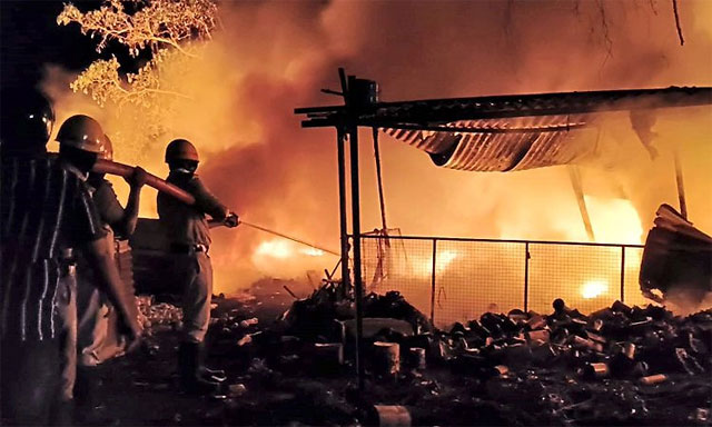 A massive fire broke out at a scrap shop near Kallapu, Katapadi resulting in the destruction of a large quantity of stored scrap material and causing significant financial loss.