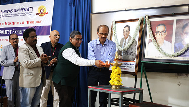 Mangaluru, Mar 27: The final year B Tech Project Exhibition–26 was successfully organized at the Srinivas University Institute of Engineering & Technology (SUIET), Mukka, Mangaluru. The event showcased the innovative and technical expertise of final-year engineering students across multiple disciplines. The programme was formally inaugurated by the chief guest, Shrinivas Bhat (director – HR Services at Indivillage Tech Solutions Pvt Ltd), and the guest of honour, Bharatesh Bangera (group project manager at Novigo Solutions Pvt Ltd) by lighting the ceremonial lamp. Dr K Satyanarayana Reddy, vice chancellor, Srinivas University) presided over the programme. Dr Ramakrishna N Hegde (dean of SUIET Mukka), and Prof Anand S Uppar (project coordinator) were present on the dais.
