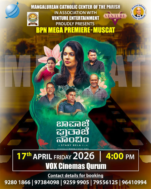 Muscat, Apr 1: The Mangalorean Catholic Centre of the Parish (MCCP), in association with Venture Entertainment, is all set to present the Muscat premiere of the highly acclaimed Konkani film ‘Bapache Putache Navim’ (BPN). The premiere show is scheduled for April 17 at 4 pm at Vox Cinemas, Qurum, Muscat.