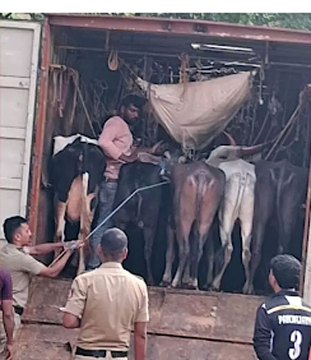 According to police sources, a container truck was illegally transporting cattle from Hassan towards Kerala.