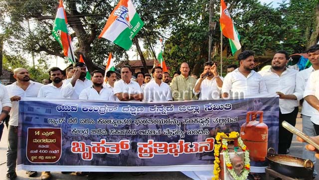 Mangaluru, Apr 15: Condemning the steep rise in cooking gas prices and alleging the failure of the BJP-led central government, the Dakshina Kannada District Youth Congress Committee staged a protest on Wednesday near Kadri Circle.