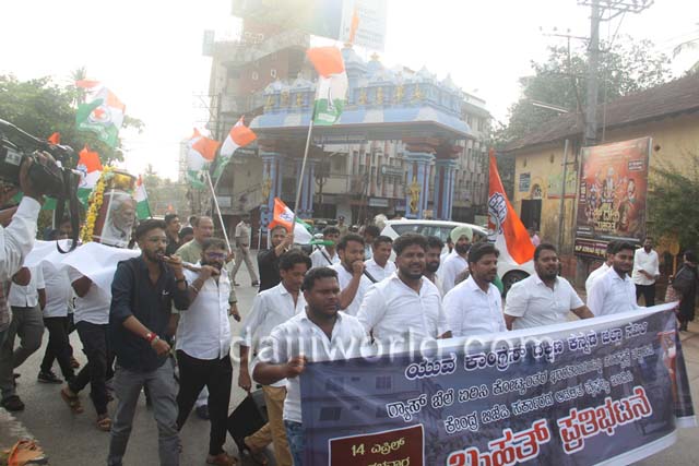 Youth Congress leaders including state secretary Abhinandan Harish, district vice presidents Basheer and Suneeth Desai, and leaders Farooq Perne, Asif Bajal, Samarth Bhat, Prithviraj, Melvin, Chetan, Mahesh, and Prajwal participated in the protest.