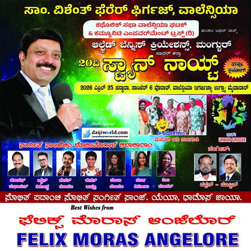 Mangaluru, Apr 17: The cultural landscape of Mangaluru is set to witness a significant milestone as Alfred Bennis Creations, in collaboration with the Catholic Sabha Valencia Unit and the Community Empowerment Trust, presents the landmark 20th 'Stany Nite'. The grand musical extravaganza is scheduled for Saturday, April 25 at 6 pm at the Valencia Church Grounds.