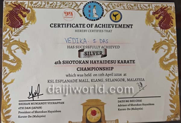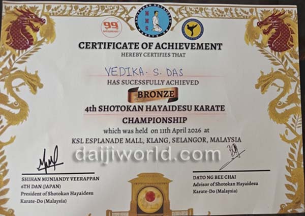 Vedhika achieved this feat at the 4th International Shotokan Hayadese Karate Championship held on April 11 in Kuala Lumpur, Malaysia. Having started karate training in 2024, it is notable that she has reached this level within just one year. With consistent practice over the past year, she has already earned a yellow belt. Representing the Western Institute of Martial Arts Academy, she trained under the guidance of Kyoshi Surendra B, Kyoshi Victor D’Souza, and Sensei Aneesh B, developing her skills.