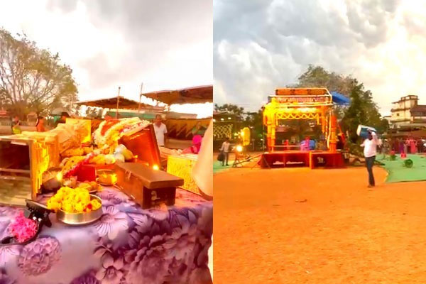 In Mangaluru’s Shaktinagar, the sudden gale-force winds severely disrupted a Yakshagana Bayalata performance. The stage (rangastala) was completely covered in thick dust, while the green room (chowki), shamiana, and decorative items were scattered by the wind.
