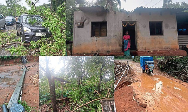 Vehicle mishaps: In Ujire, a massive tree branch crashed onto a moving car. A journalist travelling in the vehicle had a miraculous escape, though the car was significantly damaged. Another car belonging to Dinesh Acharya was also damaged by a falling tree.