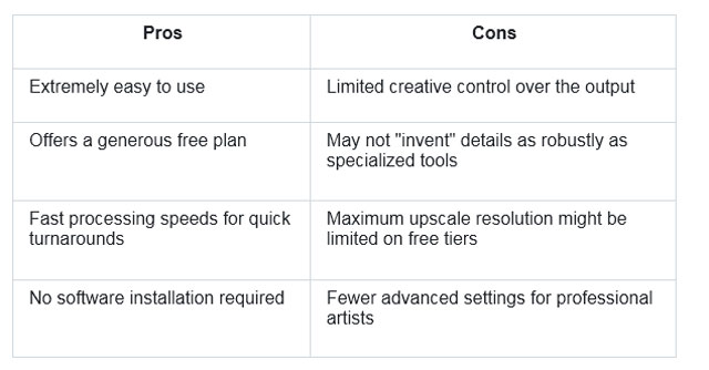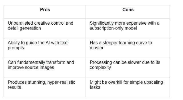 The trade-off for this power is a higher cost and a more involved workflow. Users need to experiment with prompts and settings to achieve their desired outcome, making it less suitable for those who just need a quick resolution boost. It's a premium tool for creators who see AI as a collaborative partner in the artistic process.