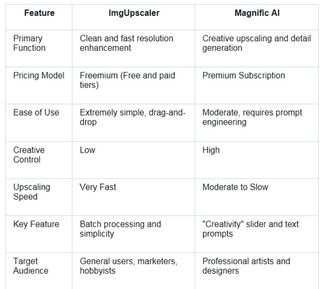 To make the choice clearer, here’s a direct comparison of ImgUpscaler and Magnific AI across several key factors.