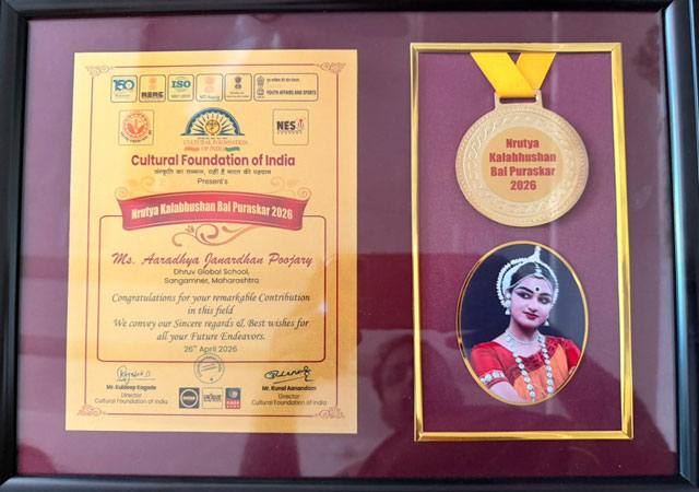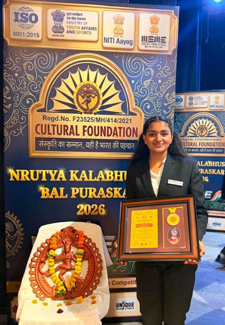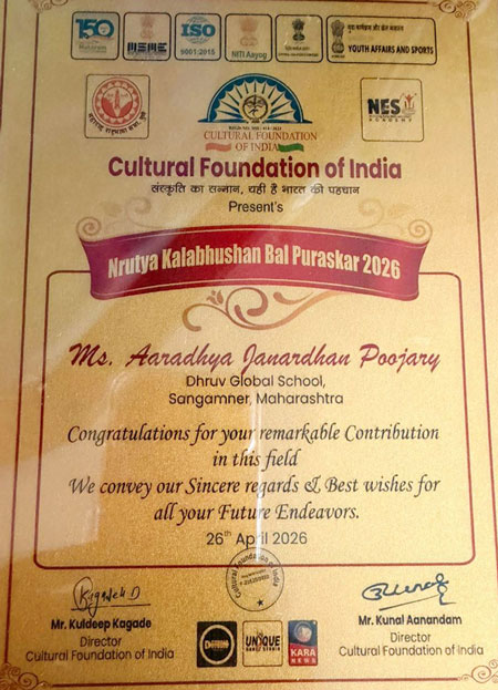 Nashik, Apr 27: Yashodhara Laxmikant Naikawadi and Aradhya Janardhan Poojary, students of Dhruva Global School, have been conferred with the prestigious national-level 'Nrityakala Bhushan Bala Award 2026' for their outstanding achievements in the field of dance.