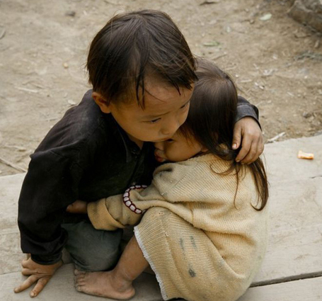 The picture shows two young children hugging each other… the little girl clinging to her brother for shelter.