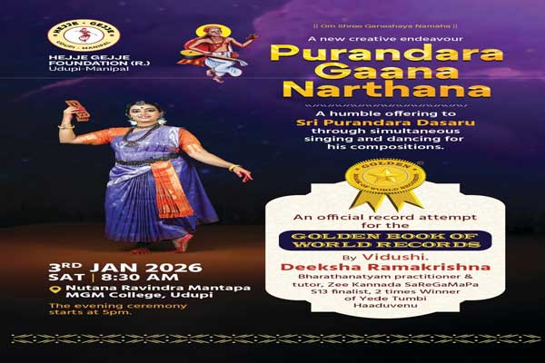 ಉಡುಪಿ , ಜ.01 (DaijiworldNews/ AK): ಹೆಜ್ಜೆ ಗೆಜ್ಜೆ ಉಡುಪಿ-ಮಣಿಪಾಲದ ಸಹ ನಿರ್ದೇಶಕಿಯಾದ ವಿದುಷಿ ದೀಕ್ಷಾ ರಾಮಕೃಷ್ಣ (ಭರತನಾಟ್ಯ ಕಲಾವಿದೆ ಮತ್ತು ಝೀ ಕನ್ನಡ ಸ ರೆ ಗ ಮ ಪ ಸೀಸನ್ 13 ರ ಫೈನಲಿಸ್ಟ್, 2 ಬಾರಿ ಈ ಟಿವಿ ಎದೆ ತುಂಬಿ ಹಾಡುವೆನು ವಿನ್ನರ್ , ಚಲನಚಿತ್ರ ಹಿನ್ನೆಲೆಗಾಯಕಿ , ಆಕಾಶವಾಣಿ ಬಿ ಹೈ ಗ್ರೇಡ್ ಕಲಾವಿದರು, ರಾಜ್ಯ ರಾಷ್ಟ್ರ ಮಟ್ಟದ ಸ್ಕಾಲರ್ಶಿಪ್ ಪಡೆದವರು) ಅವರಿಂದ ಶ್ರೀ ಪುರಂದರದಾಸರ ರಚನೆಗಳಿಗೆ ಏಕವ್ಯಕ್ತಿ ಗಾನ ನೃತ್ಯಾರ್ಪಣೆ ನಡೆಯಲಿದೆ ಮತ್ತು ಅವರು ಈ ಪ್ರಯತ್ನ ವನ್ನು ಗೋಲ್ಡನ್ ಬುಕ್ ಆಫ್ ವರ್ಲ್ಡ್ ರೆಕಾರ್ಡ್ಸ್ ಗೆ ಸೇರಿಸಲು ಪ್ರಯತ್ನಿಸುತ್ತಿದ್ದಾರೆ.