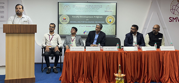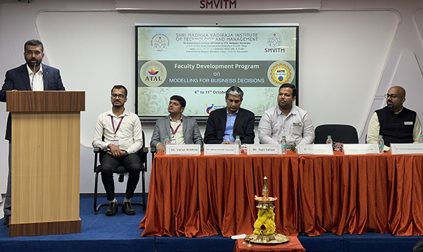Udupi, Oct 7: The Department of Business Administration of SMVITM, in collaboration with ATAL Academy, inaugurated a 6-day Faculty Development Program (FDP) on “Modelling for Business Decisions” on October 6, aimed at equipping faculty members and researchers with essential tools and techniques to enhance decision-making through data-driven modelling.