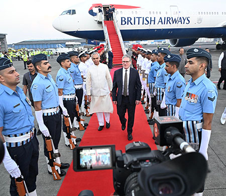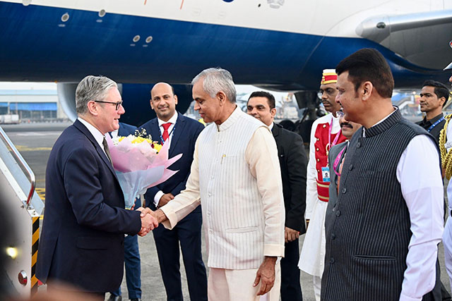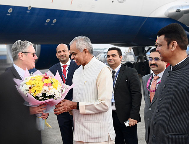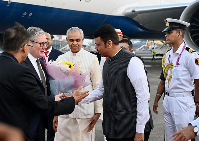 Mumbai, Oct 8: British Prime Minister Keir Starmer arrived in Mumbai this morning, receiving a warm welcome from governor of Maharashtra and Gujarat, Acharya Devvrat and Maharashtra chief minister Devendra Fadnavis.