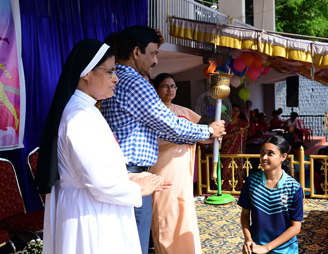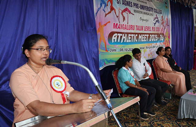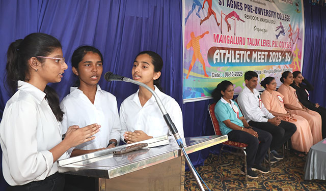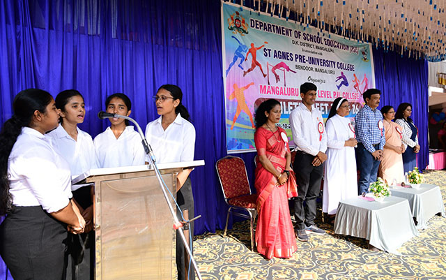 The event began with a prayer song, invoking God's blessings for the success of the meet. The gathering was warmly welcomed by Likitha, lecturer in home science followed by the lighting of the lamp by the dignitaries. Athletes of St Agnes PU College Michelle, Thanushree, Drithi, Ananya, Niharika and Mithali carried the torch, representing determination and perseverance which added grandeur to the event. The oath-taking ceremony was led by Michelle, state level wrestler and a proud student of St Agnes PU College pledging fairness and sportsmanship.