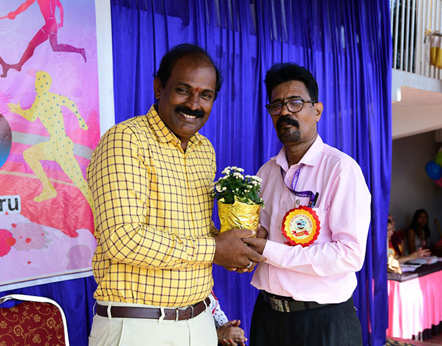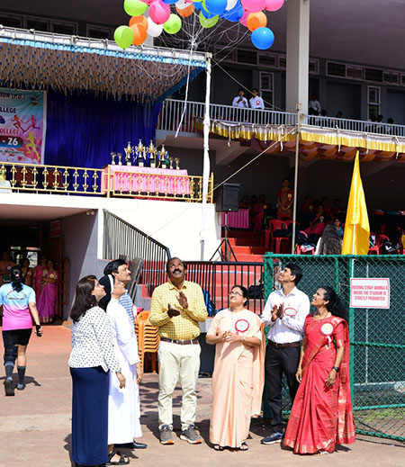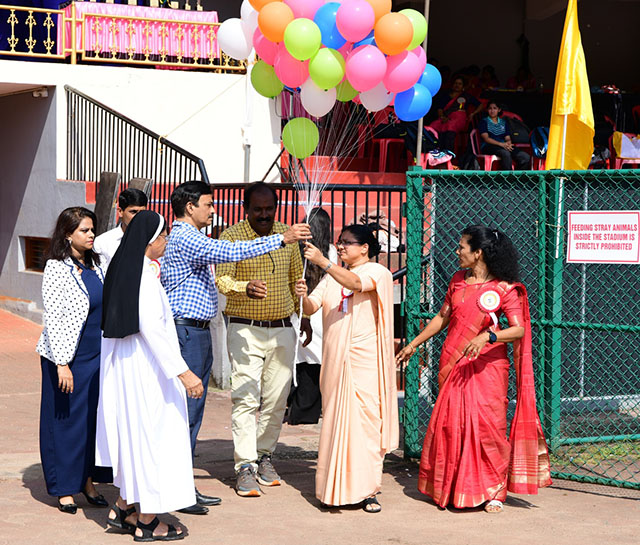 The releasing of colourful balloons by all the dignitaries’ symbolized joy, unity & the true spirit of sports. In his inaugural address, Naveen Shetty highlighted that in sports, there exists happiness, anger, competition and rivalry, yet it remains the one sphere that does not discriminate between caste or creed. He emphasized that sports is a way of life and encouraged students to spend each day at least one hour engaging in sports and advised them to eat healthy, stay healthy, think healthy and to keep away from drugs and excessive use of social media.