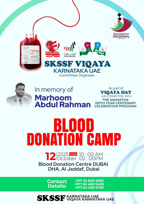 This year, in conjunction with the Samastha 100th Anniversary and in memory of Marhoom Abdul Rahman, the grand blood donation camp will be held on Sunday, October 12, 2025, from 9:30 am to 2 pm The organisers have requested all expatriate well-wishers to participate in large numbers and become blood donors.