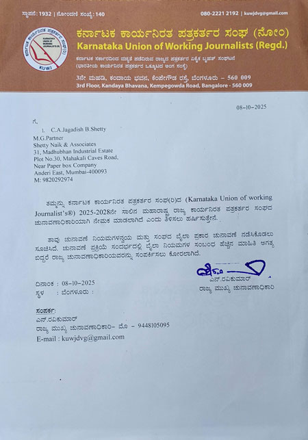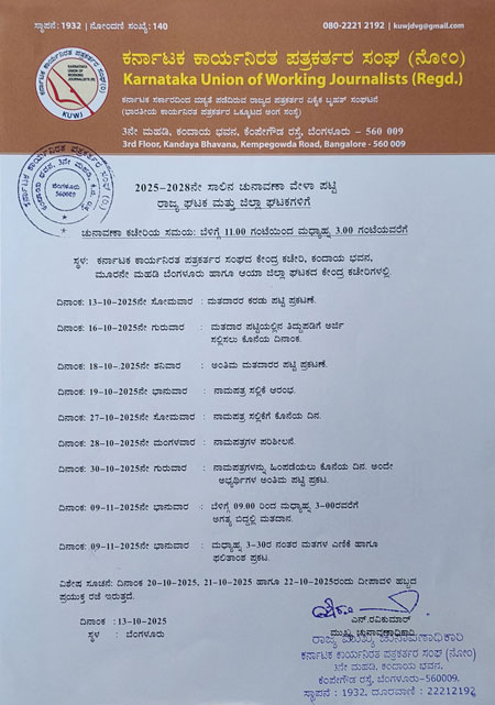 Mumbai, Oct 14: The Karnataka Union of Working Journalists (KUWJ), a prestigious representative organization of working journalists in the state, has announced elections for its 2025-2028 administrative term. KUWJ’s chief election officer N Ravikumar (Telex) has issued an official notification declaring the election.
