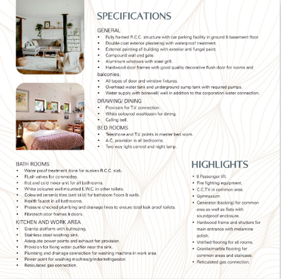 Each flat features air-conditioning provision in all bedrooms, leak-proof bathrooms with modern fittings, granite kitchen platforms with stainless steel sink, and ample power points for all appliances — making it a home ready for contemporary living.