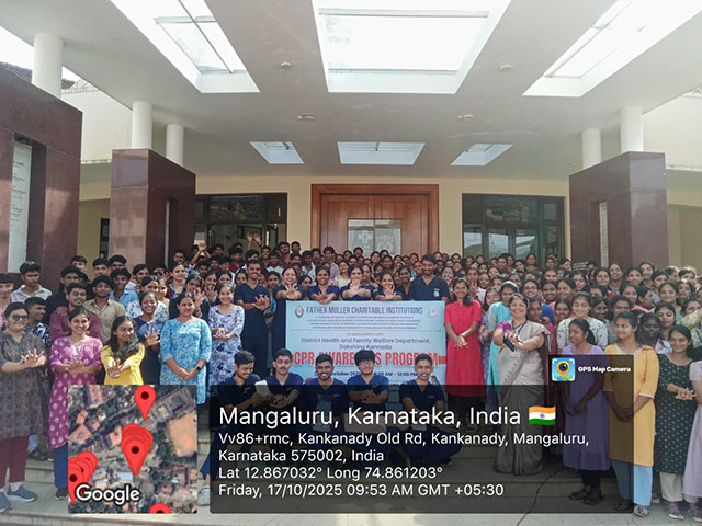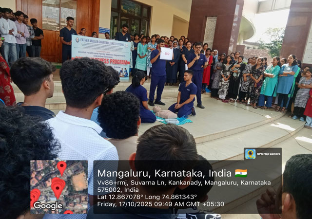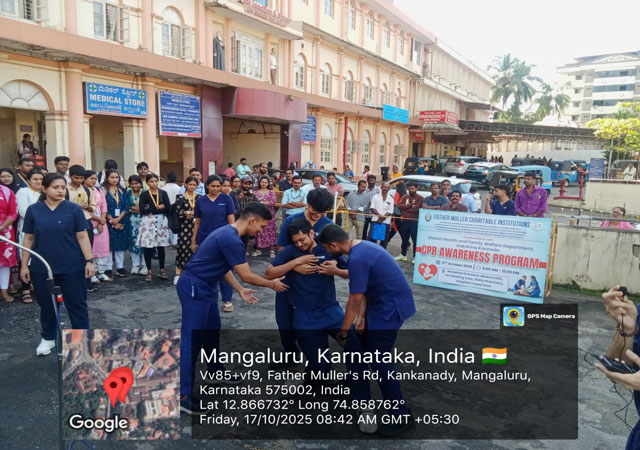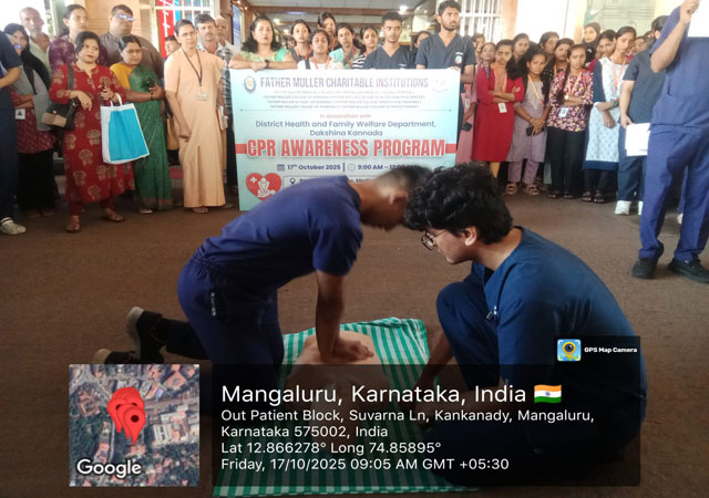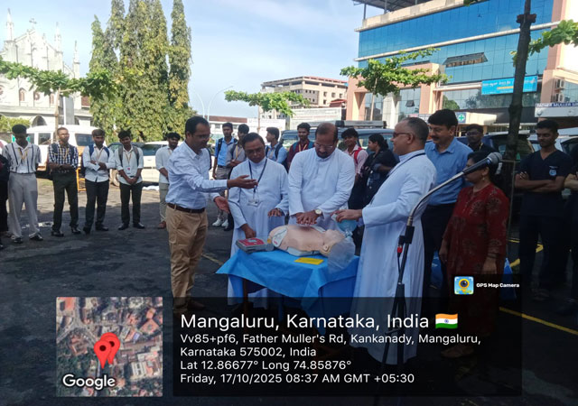 Mangaluru, Oct 18: ‘Restart a Heart Day’ was observed to spread awareness about the importance of Cardiopulmonary Resuscitation (CPR) and the need for timely emergency response during cardiac arrests. The programme was organized by Father Muller Medical College and Hospital in association with the Dakshina Kannada zilla panchayat and the district health and family welfare office, Mangaluru, as part of the Nationwide CPR Awareness Week held from October 13-17 across Dakshina Kannada district. The aim was to educate people on how quick action and basic life-saving skills can make the difference between life and death.
