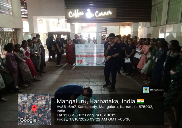 To create widespread awareness, CPR demonstrations and interactive sessions were organized across the Father Muller campus at various key locations such as the reception entrance, medical OPD, ICU waiting area, utility pharmacy, and chapel area between 8:30 am and 12 pm. Pamphlets, posters, and live demonstrations helped students, staff, and visitors understand the correct steps of performing CPR.