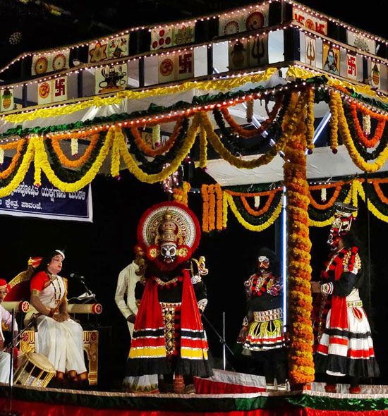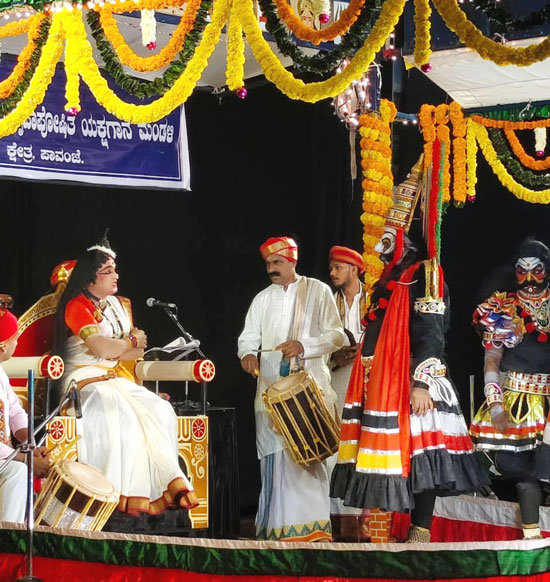 The ‘Dashavatara’ Yakshagana featured Bharat Shetty Siddakatte and Manvit Shetty Ira as Bhagavatas. Gurupraasad Bolinjadak, Prashanth Shetty Vagenadu, and Kaushik Rao Puttige performed the chende-maddale, accompanied by Purnesh Acharya on chakrataal. Rajesh Nitte, Yogeesh Kadaba, and Vishwas Kavoor played female roles, while Mavvaru Balakrishna Maniyani and Sandesh Mandar provided comic relief. Supporting roles were performed by Radha Krishna Navad, Subray Holl Kasaragod, Divan Shivashankar Bhat, Dinesh Shetty Kavalakatte, Santosh Kumar Manya, Rakesh Rai Adka, Madhav Kolattamjal, Mohan Bellipadi, Manish Patali, Lokesh Muchuru, Ranjith Mall, Ramesh Patrame, Divakar Kaniyuru, Madhuraj Permude, Suhas Panjikallu, Lakshan Permude, Bhuvan Moodujeppu, and Manvit Nidodi.
