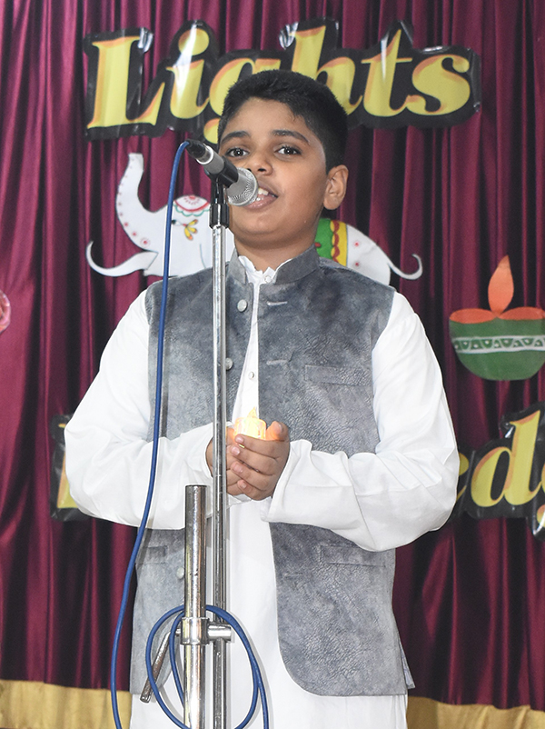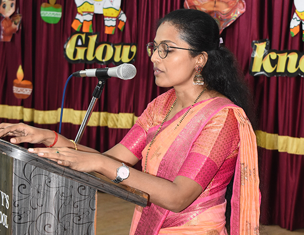 The chief guest joined by the principal and all teachers lit the ceremonial diyas - symbolising the light of knowledge and wisdom imparted through education. In her inspiring address, teacher Sushmitha encouraged all to let their goodness shine through kind actions, words and smiles as one kind word, one good deed or one act of honesty would brighten someone's life. She also reminded the students that “Education is the lamp which guides every path of life.”