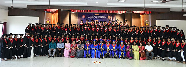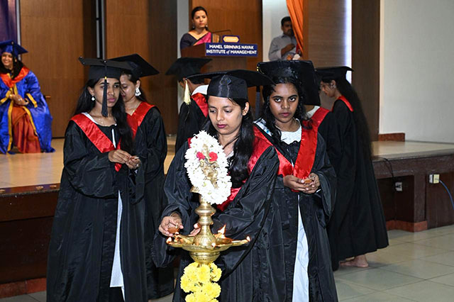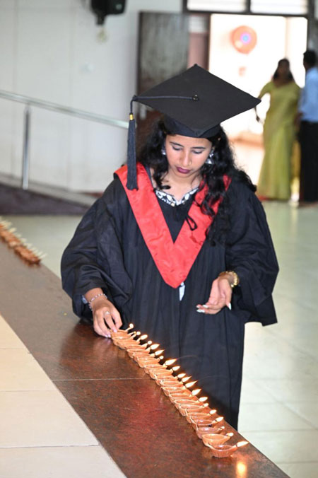 The Graduation Ceremony commenced with the traditional Jyothi Pradhan ceremony, where faculty members oiled the lamp, followed by the lighting of the lamp by the students. The programme coordinator, assistant professor Divya Achar introduced Jyothi Pradhan ceremony and assistant professor Manasa administered the MBA oath.