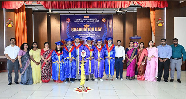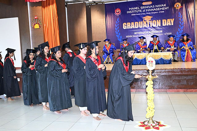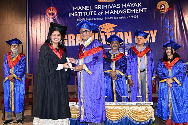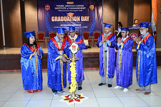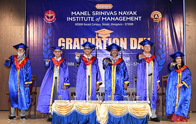 Mangaluru, Oct 21: The Manel Srinivas Nayak Institute of Management (MSNIM) organised the Graduation Day and Jyothi Pradhan Ceremony for its outgoing MBA 25th batch students (2023-2025) on Friday, October 17, at the institute's campus in Bondel. Prakash Rao Kalbavi, managing director, Kalbavi Consumer Foods Pvt Ltd, was the chief guest, and Manel Annappa Nayak, president of the Women’s National Education Society (WNES), presided. The institute’s director Dr Molly S Chaudhuri and correspondent Ajith Kamath were present. As many as 90 outgoing MBA graduates celebrated their course completion.