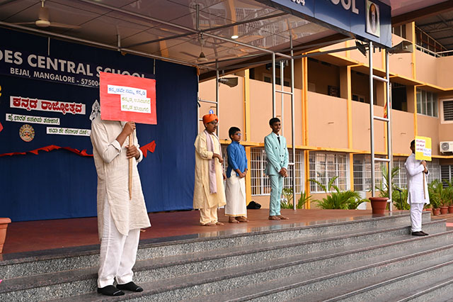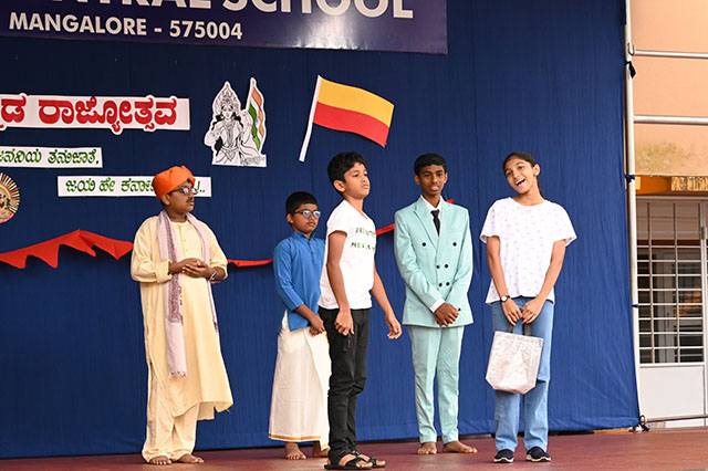 The prayer song was sung by the school choir. Saanvi and Shravanram students of class VII, delivered an inspiring welcome speech to mark the Kannada Rajyotsava Day celebration. Armaan and Naishka delivered an insightful speech highlighting the significance of the day. The students of class VII delivered a captivating spectacle, showcasing a vibrant skit, an exuberant dance performance and a soul stirring poetry recitation to commemorate the celebration. Their artistic expressions eloquently portrayed the states rich cultural legacy and traditions, enthralling the audience with their talent.